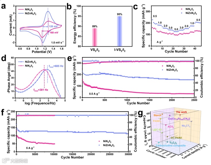 图5 NiZnN4/I2和NiN4/I2电极的电化学性能。(a)1.0 mV s-1时的CV曲线;(b)能量效率;(c)倍率性能;(d)波特图;(e)0.5 A g-1下的循环性能;(f)5 A g-1下的循环性能。(g)电化学性能比较。