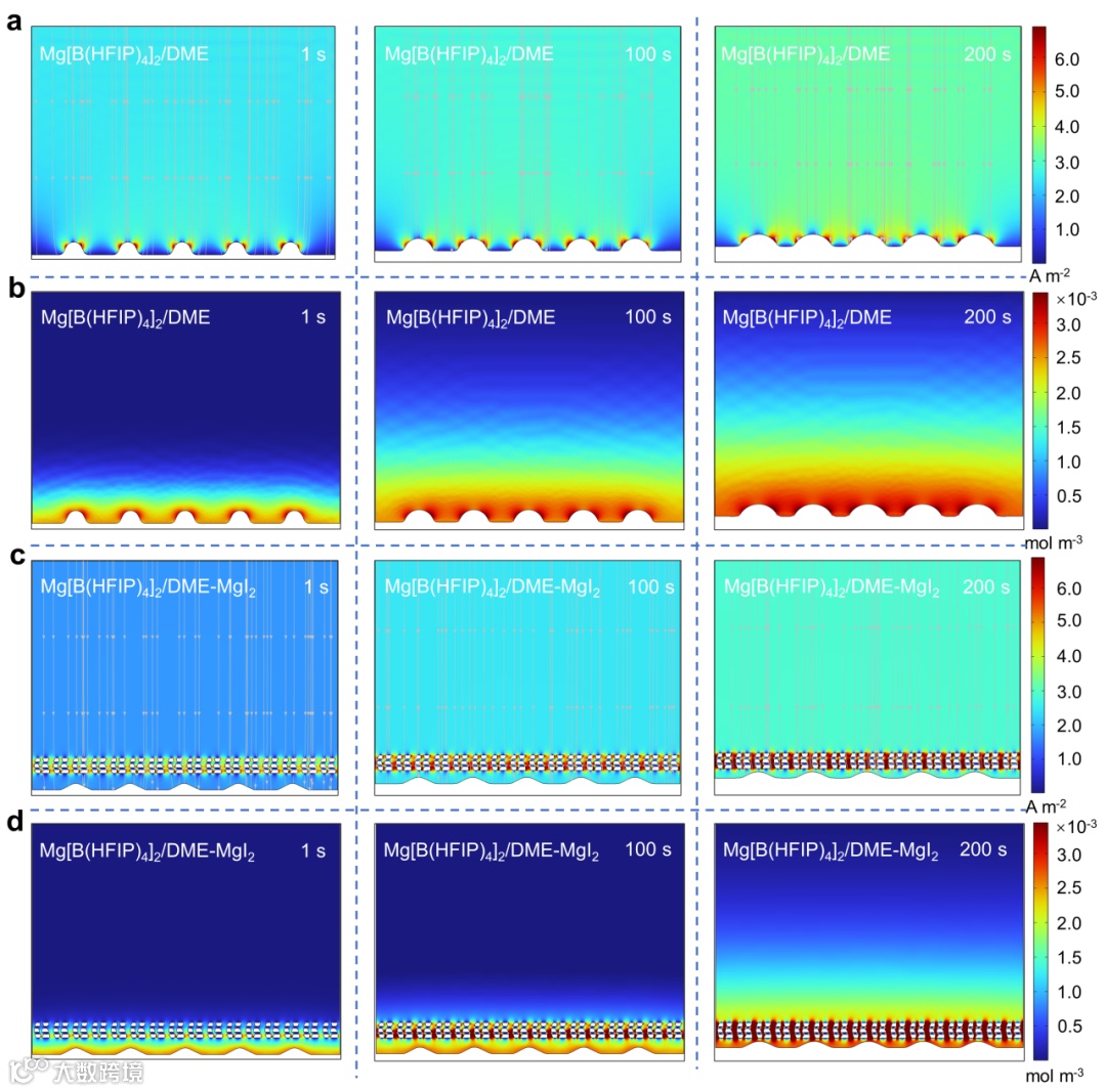 图5. COMSOL Multiphysics分别模拟了(a, b) Mg[B(HFIP)4]2/DME-MgI2和(c, d)纯Mg[B(HFIP)4]2/DME电解液中Mg阳极上(a, c) 电场和(b, d) Mg2+离子浓度分布。不同形貌的底部区域代表沉积的金属电极,其中Mg2+被还原为Mg金属。沉积时,底电极电位设置为0 V,Mg2+浓度为2 M,电流密度为0.5 mA cm-2,电解液电导率为11 mS cm-1。