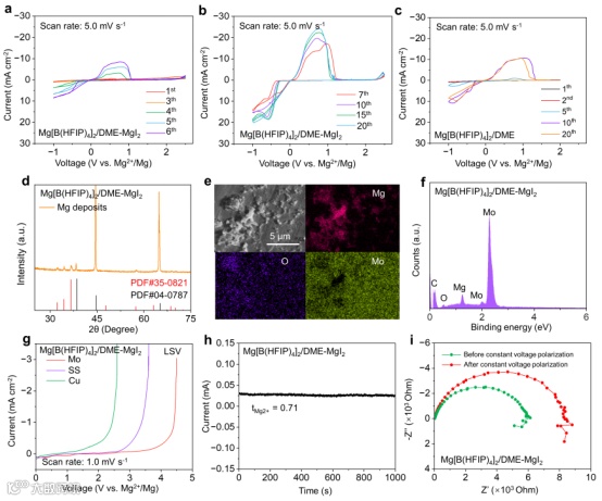 图2. BIM作为电解质的Mg||Mo电池在(a)前6圈和(b)第7-20圈电池的CV曲线,扫描速率为5 mV s-1。(c)初始的Mg[B(HFIP)4]2/DME电解液的Mg||Mo半电池在5 mV s-1扫描速率下的CV曲线。Mo集流体在Mg||Mo电池中放电15h后的XRD曲线(d),(e) SEM图像及相应的mapping图谱(f)以及EDS结果。(g)Mg[B(HFIP)4]2/DME电解液中不同工作电极(Mo、SS、Cu)的LSV曲线(扫描速率为1 mV s-1)。(h)BIM作为电解质的Mg||Mg对称电池在25℃时的直流极化曲线,施加电位差为0.005 V。(i)镁对称电池直流极化前后的交流复阻抗图。