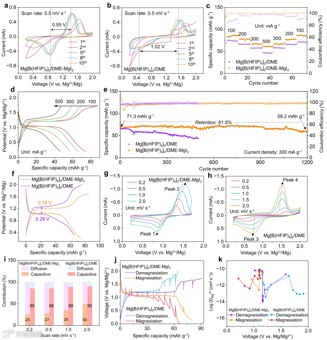 图5. Mg||Mo6S8全电池在(a)Mg[B(HFIP)4]2/DME-MgI2和(d)Mg[B(HFIP)4]2/DME电解质中的CV曲线。Mg||Mo6S8全电池在Mg[B(HFIP)4]2/DME-MgI2和Mg[B(HFIP)4]2/DME电解质中的(b)倍率性能,(c)电压-容量曲线,(e)电流密度是500 mA g-1时的循环性能。(f)使用Mg[B(HFIP)4]2/DME-MgI2和初始的Mg[B(HFIP)4]2/DMEE电解液的Mg||Mo6S8电池在100 mA g-1电流密度下的充电/放电曲线. (g)Mg[B(HFIP)4]2/DME-MgI2和(h)初始的Mg[B(HFIP)4]2/DME电解液的Mg||Mo6S8电池在0.2~2.0 mV s-1扫描速率下的(g , h) CV曲线。(i)计算得到的Mo6S8正极在Mg[B(HFIP)4]2/DME-MgI2和初始的Mg[B(HFIP)4]2/DME电解液中的电容/扩散贡献。( j ) GITT曲线在50 mA g-1的重复恒电流脉冲下测量10 分钟,然后弛豫时间为 30分钟。( k )根据( j )中GITT结果计算的相应Mg2+扩散系数