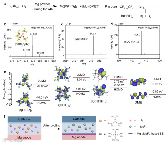 图1. (a) 制备Mg[B(ORF)4]2, RF=fluorinated alkyl)的反应方程。(b~c)分别为(b)中Mg[B(HFIP)4]2/DME电解质在[676、682]区域的负扫描模式和(c) [239、244]区域的正扫描模式的ESI-MS结果。(d) Mg[B(HFIP)4]2/DME电解液在[390、420]区域的ESI-MS结果。(b)中的插图是初始的Mg[B(HFIP)4]2/DME电解质(原子:白色,氢;杂色,碳;红色,氧;黄色,氟;深黄色,硼)中阴离子的结构示意图。(e)计算了B(HFIP)3、[B(HFIP)]-、[B(HFIP)I]-和DME分子的LUMO和HOMO能级。(f)Mg[B(HFIP)4]2/DME-MgI2电解质的原位制备过程及其生成Mg[B(HFIP)4]2和MgI2/MgF2基SEI膜的双功能特性。
