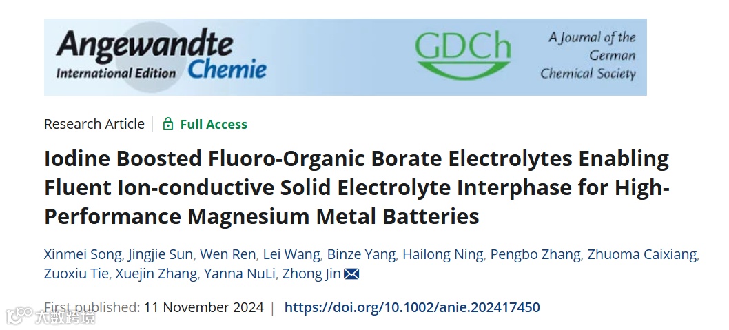 近日,南京大学金钟教授团队在国际知名期刊Angewandte Chemie International Edition上发表题为“Iodine Boosted Fluoro-Organic Borate Electrolytes Enabling Fluent Ion-conductive Solid Electrolyte Interphase for High-Performance Magnesium Metal Batteries”的研究论文。作者首先提出了合成末端取代基氟化阴离子的硼基镁盐电解质(Mg[B(ORF)4]2, RF = fluorinated alkyl))新型简易方法:以合成Mg[B(HFIP)4]2/DME为例,将在2 mL DME溶剂中加入1.0 mmol的B(HFIP)3和0.5 mmol单质碘,然后在溶液中加入过量的镁粉;搅拌24 h以上过滤后,得到清澈无色的透明溶液,即Mg[B(HFIP)4]2/DME电解质。然而,所获得的初始的Mg[B(HFIP)4]2/DME电解质在负极表面仍会产生钝化问题,为了解决这一问题,结合MgI2是镁负极SEI中优异的传导镁离子成分,我们将配方中的镁粉转换成金属镁负极,并直接溶解B(HFIP)3和I2到DME中作为电解质,得到的Mg[B(HFIP)4]2/DME-MgI2电解质会在充放电过程中原位形成镁盐的同时,还能在镁片表面形成以MgI2为主的SEI界面。因此得到了与初始的Mg[B(HFIP)4]2/DME电解质相比更加优异的对称电池和半电池性能。当与Mo6S8正极匹配时,得到了出色的正极匹配性,优异的动力学性能和循环稳定性,循环稳定性超过了之前报道的所有硼基电解质。这项研究为镁电池硼基电解质引入了一种前景广阔的卤素增强策略,对多价二次电池的发展和优化至关重要。