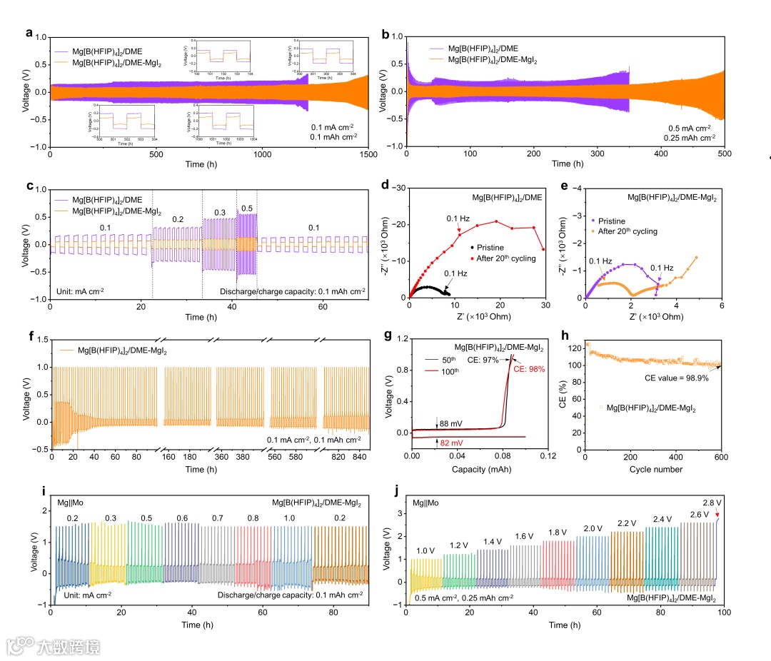 图3. Mg||Mg对称电池在Mg[B(HFIP)4]2/DME和Mg[B(HFIP)4]2/DME-MgI2电解质分别在电流密度为(a)0.1 mA cm-2(面积比容量为0.1 mAh cm-2)和(b)0.5 mA cm-2(面积比容量为0.25 mAh cm-2)的过电位。(c)Mg||Mg在Mg[B(HFIP)4]2/DME和Mg[B(HFIP)4]2/DME-MgI2电解质在保持面积比容量为1.0 mAh cm-2的情况下,电流密度从0.1 mA cm-2到0.5 mA cm-2时的过电位。以(d)Mg[B(HFIP)4]2/DME和(e)Mg[B(HFIP)4]2/DME-MgI2为电解液,Mg||Mg对称电池在最初状态和循环20次后的EIS曲线。以Mg[B(HFIP)4]2/DME-MgI2为电解质时,(f)Mg||Mo电池的循环圈数-库伦效率曲线,(g)对应的容量-电压曲线和(h)库仑效率-循环圈数曲线。(i)Mg[B(HFIP)4]2/DME和Mg[B(HFIP)4]2/DME-MgI2作为电解液在Mg||Mo半电池的库仑效率-循环圈数曲线。(j)以及不同截止电压下对应的电压-时间曲线。