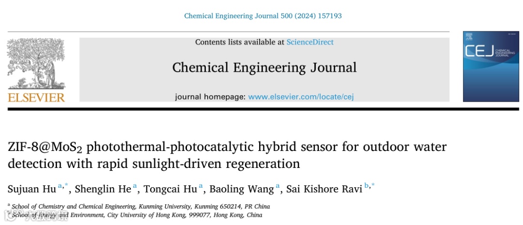 近日,昆明学院胡素娟教授课题组和香港城市大学Sai Kishore Ravi教授在国际期刊Chemical Engineering Journal上发表的题为“ZIF-8@MoS2 photothermal-photocatalytic hybrid sensor for outdoor water detection with rapid sunlight-driven regeneration”的研究论文。该研究基于传统电化学传感器电极易污染、再生效率低、再生时间长、难以重复使用等问题,设计ZIF-8@MoS₂核壳结构的光电热-光催化复合传感器,通过光热和光催化过程的协同效应,不仅实现了对抗生素的高灵敏度、快速且可再生的电化学检测(对磺胺甲恶唑的检测限低至约12 nM,柔性传感器为70 nM),还可在户外自然太阳光照射下约13分钟实现约100%的再生,重复使用次数高达24次,基于此构建的小型化便携式光驱动可再生应急检测系统,能快速识别水中抗生素的存在及浓度,在应急检测领域表现出色,为环境监测、食品安全及医疗诊断等领域的水质检测提供了基础。
