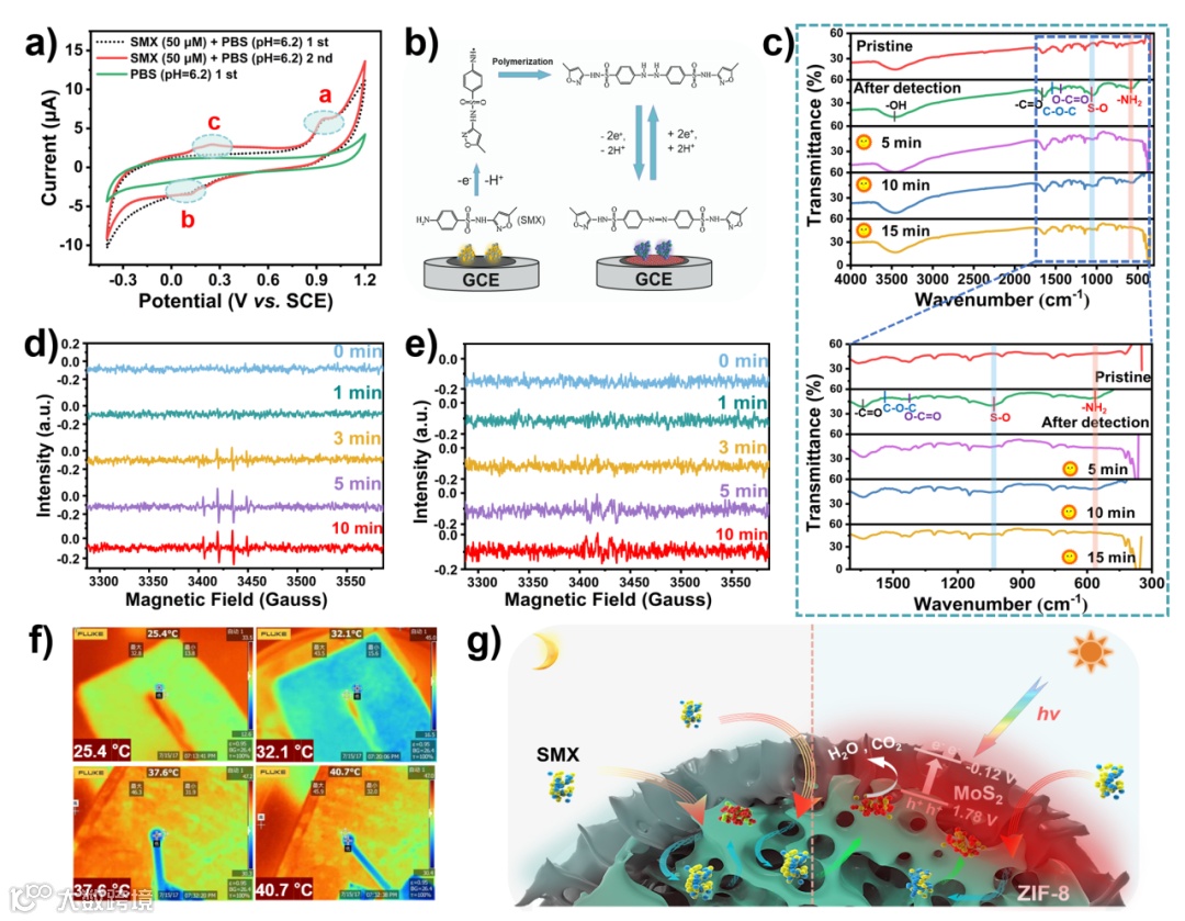 图4. (a) ZIF-8@MoS2(10%) 复合材料的CV测试;(b) 在电化学检测SMX 过程中提议的电极污染过程;(c) ZIF-8@MoS2(10%) 在阳光照射前后分别5、10 和 15 分钟的红外;(d) DMPO-•OH 和(e) DMPO-•O− 在不同照射时间下形成的EPR图谱;(f) ZIF-8@MoS2(10%) 电极在太阳光照射下红外线测温仪的数码照片(0 分钟、4 分钟、8分钟和 13 分钟);(g) 提出的光热-光催化检测和再生机制。