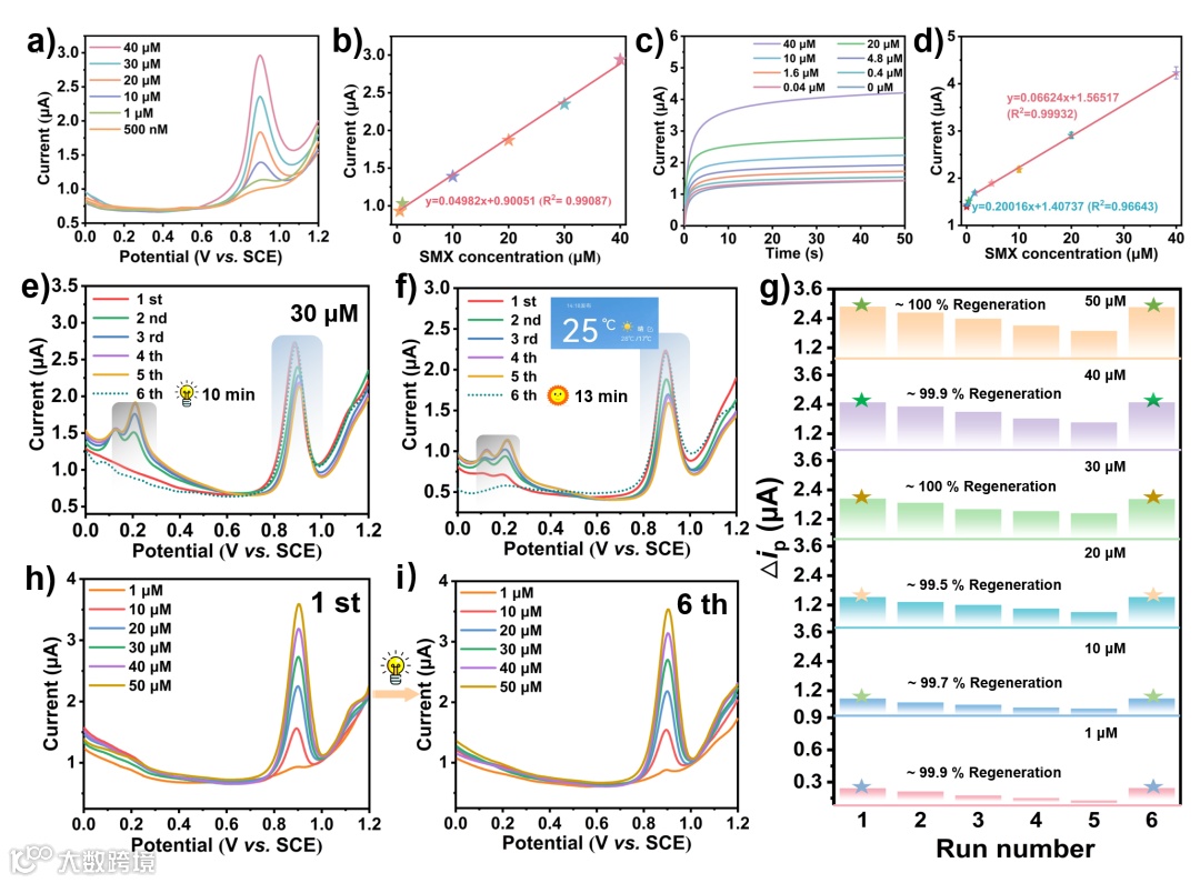 图3. (a) ZIF-8@MoS2(10%) 复合材料的DPV响应;(b) 阳极氧化光电流密度与SMX浓度的对应图;(c) 基于ZIF-8@MoS2(10%) 的传统电化学检测的I-t曲线;(d) 电流密度与SMX浓度的对应图;(e) ZIF-8@MoS2(10%) 在30 μM SMX中的DPV响应(第1至第5次运行曲线为连续的DPV响应,第6次运行曲线为光照射10分钟后的DPV响应);(f)ZIF-8@MoS2(10%) 在30 μM SMX中的DPV响应(第1至第5次运行曲线为连续的DPV响应,第6次运行曲线为自然阳光照射13分钟后的DPV响应);(g)不同SMX浓度的Δip与运行次数的关系;(h) ZIF-8@MoS2(10%)复合材料不同SMX浓度的第1次测量的DPV响应;(i)氙灯光照射后第6次测量的DPV响应。