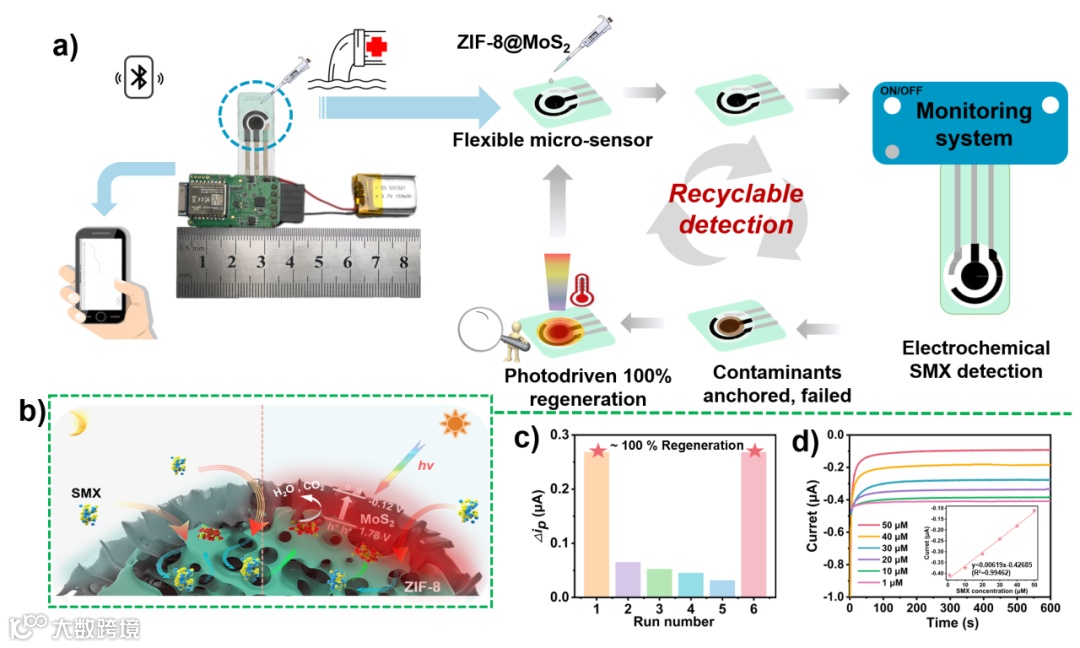 该系统基于ZIF-8@MoS₂柔性电化学传感器,并将电源、智能手机、监测模块等紧凑集成,实现了便携化和光驱动再生功能。通过太阳光照射,这一系统能够高效去除电极表面污染物,迅速恢复检测性能,使其在水质监测中能够长时间、低成本地循环使用。系统可有效适用于应急监测情境,具备环保、无二次污染的特点,进一步拓展了水质快速检测技术的应用场景。