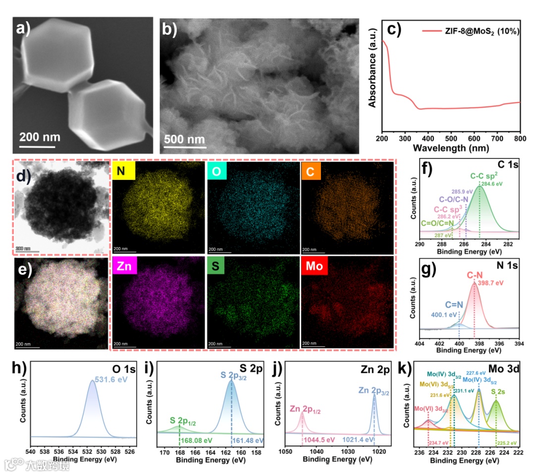 图2. (a) ZIF-8和(b) ZIF-8@MoS2(10%) 复合材料的SEM图像;(c)ZIF-8@MoS2(10%) 复合材料的UV-vis DRS;(d和e)ZIF-8@MoS2(10%) 复合材料的STEM和元素分布图;ZIF-8@MoS2(10%) 复合材料的高分辨率XPS光谱:(f) C 1s,(g) N 1s,(h) O 1s,(i) S 2p,(j) Zn 2p和 (k) Mo 3d。