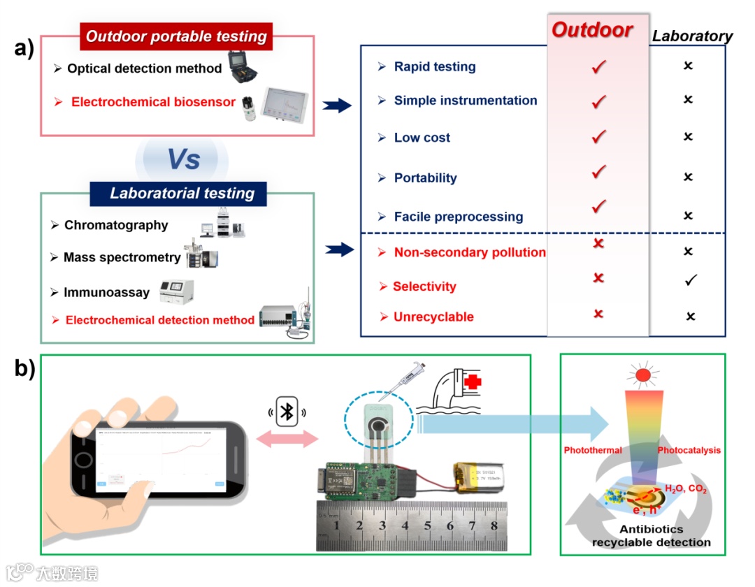图1. (a) 户外便携式测试设备与实验室测试设备的优缺点;(b) 低成本、高选择性、无二次污染的便携式应急检测系统的示意图,能够进行光驱动再生,旨在用于户外水体抗生素检测。