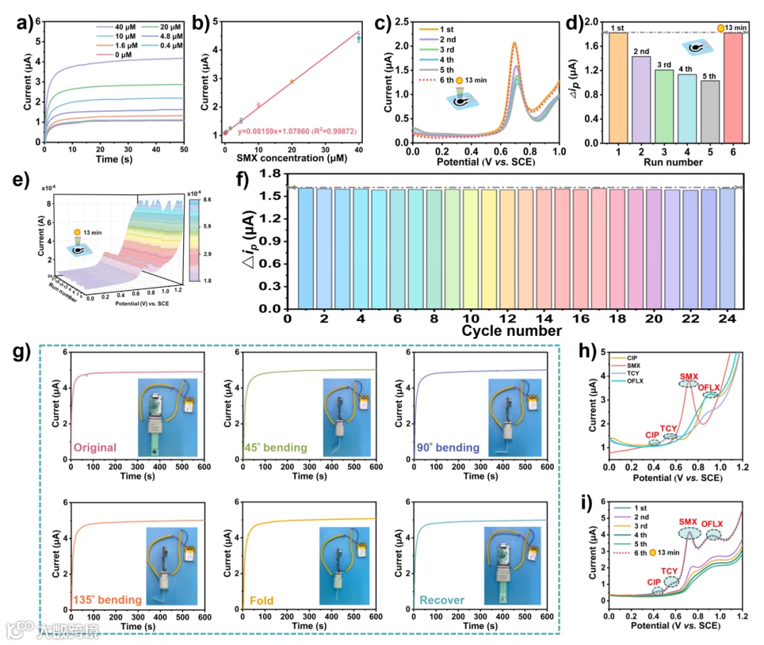 图5. (a) 不同SMX浓度下基于ZIF-8@MoS2的柔性电化学检测传感器的I-t曲线和 (b) 相应的电流密度与SMX浓度的关系图; ZIF-8@MoS2(10%) 光驱动再生为基础的柔性电化学检测传感器:(c) 30 μM SMX的6个循环DPV响应(第1-5次运行曲线为连续DPV响应,第6次运行在自然阳光照射下13分钟);(d) Δip与运行次数的对应图;(e) 在自然阳光照射下每次运行间隔13分钟的连续DPV测试;(f) Δip与循环次数的对应图;(g) 在不同弯曲角度下的柔性电极I-t测试;(h) SMX、OFLX、TCY和CIP的DPV响应;(i) 30 μM SMX+OFLX+TCY+CIP PBS溶液的6个循环DPV响应(第1-5次运行曲线为连续DPV响应,第6次运行在自然阳光照射下13分钟)。