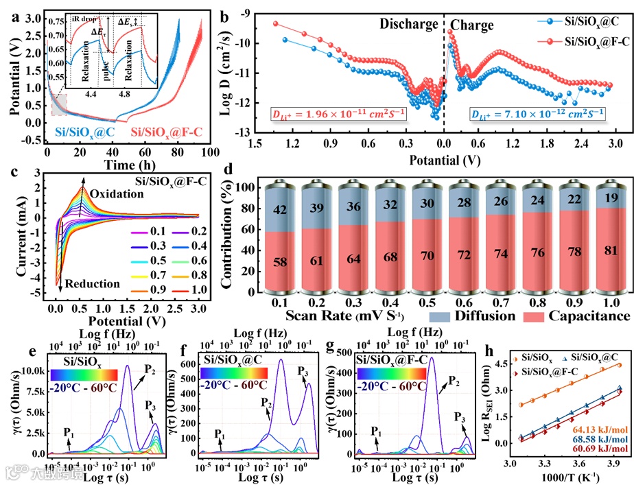 图4. Si/SiOx@F-C和Si/SiOx@C的电化学表征和活化能测试
