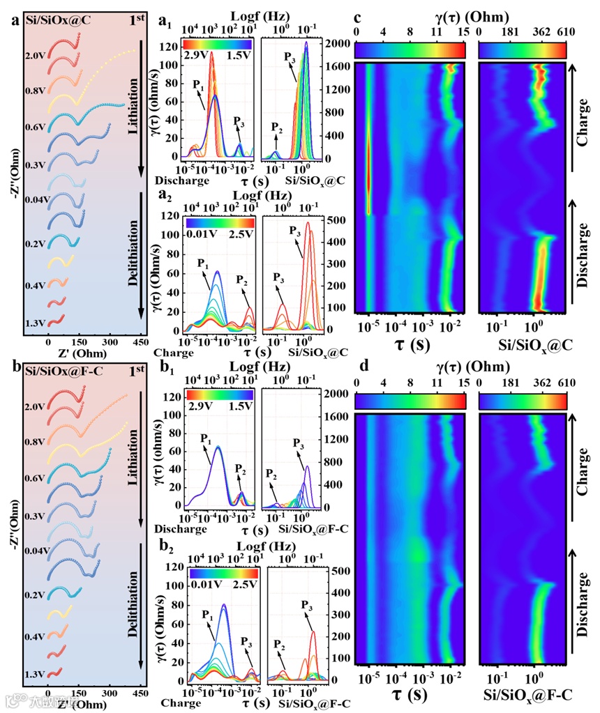 图6. Si/SiOx@F-C和Si/SiOx@C的EIS及DRT曲线