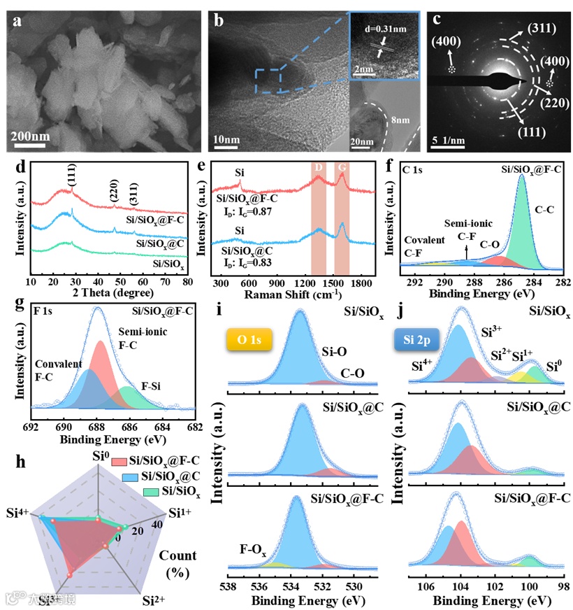 图2. Si/SiOx、Si/SiOx@F-C和Si/SiOx@C电极材料的结构和成分表征