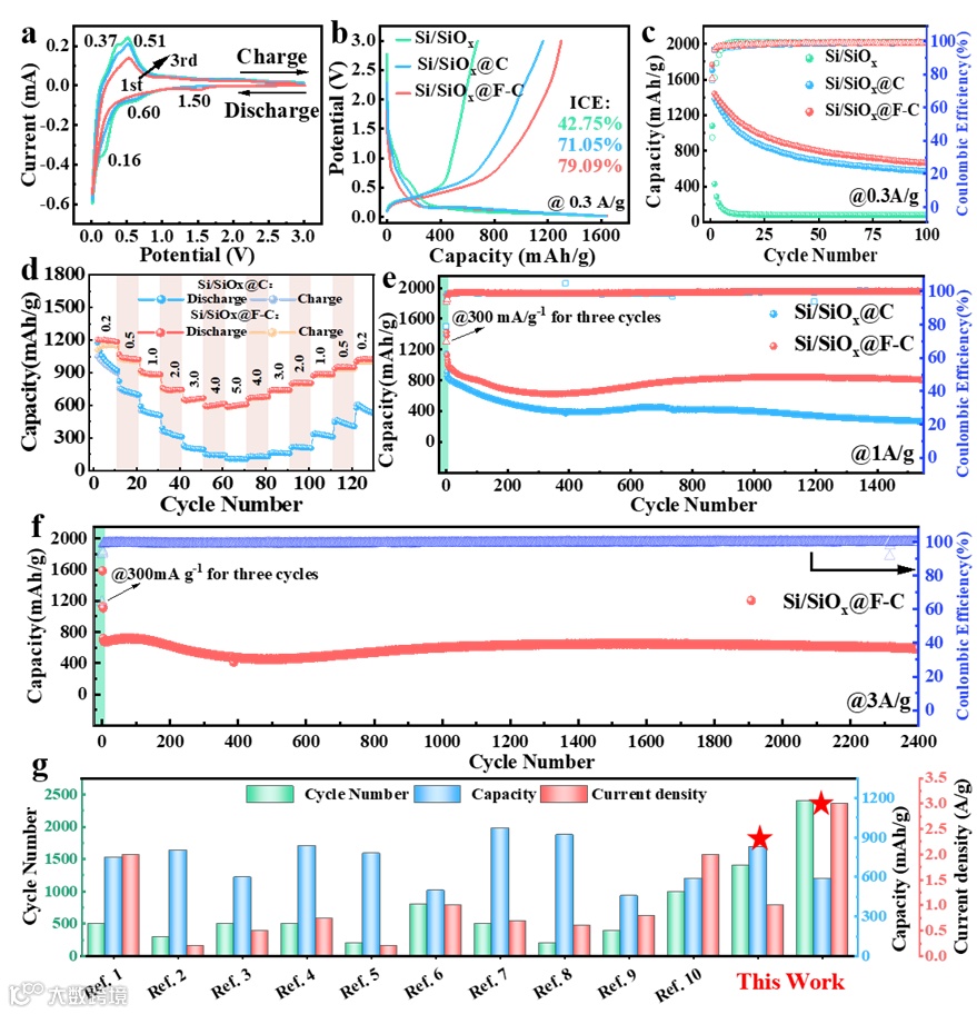 要点二:Si/SiOx@F-C综合储锂性能和长循环性能测试