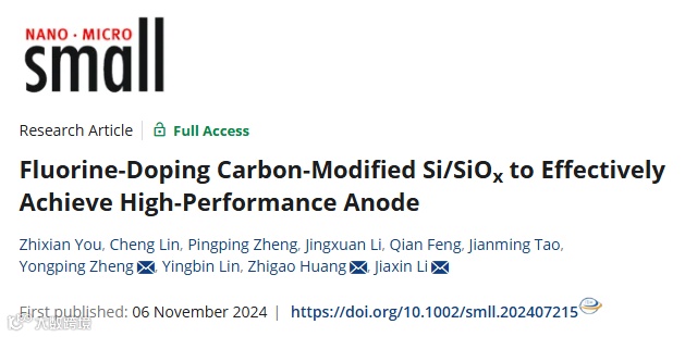 近日,福建师范大学李加新、黄志高、郑勇平等人在知名期刊Small上发表题为“Fluorine-Doping Carbon-Modified Si/SiOx to Effectively Achieve High-Performance Anode”的研究论文。该工作介绍了一种简单高效的表面氟掺杂碳涂层包覆策略,所制备氟碳层中的F元素能够促进富LiF的SEI膜构建,生成高应力、高电导、高离导的固态电解质界面,这有效抑制了硅氧材料膨胀导致的电极失效,显著提升了电极材料初始库伦效率、综合锂存储能力和循环寿命。这种低成本又简便的设计策略为高性能硅基负极材料的开发提供了一种前景广阔的设计思路。