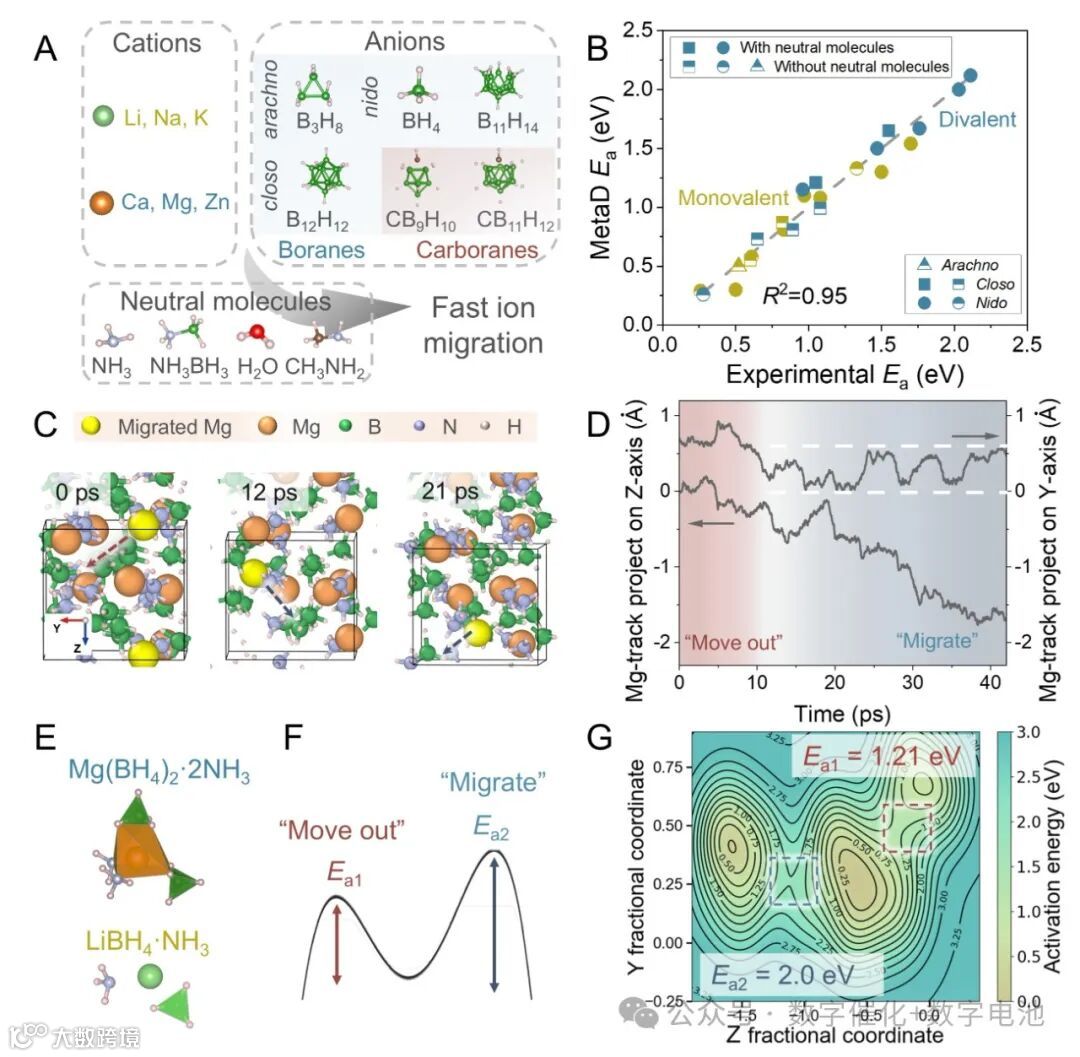 MetaD模拟还帮助我们识别出一种新颖的阳离子迁移机制。以图2C所示的Mg²⁺迁移快照为例,从0 ps到12 ps,Mg离子(黄色标记)从其原始的四面体配位位点开始离域,逐步靠近中性分子(NH3)并进入间隙位置。12–21 ps阶段,Mg离子继续沿间隙迁移,并交替与周围BH4阴离子形成配位,最终完成整体迁移过程。空间轨迹图(图2D)显示:在40 ps的模拟时间内,Mg离子迁移距离约为纵向1.9 Å、垂向1.0 Å。在整个迁移过程中可观察到两个准稳定态:
