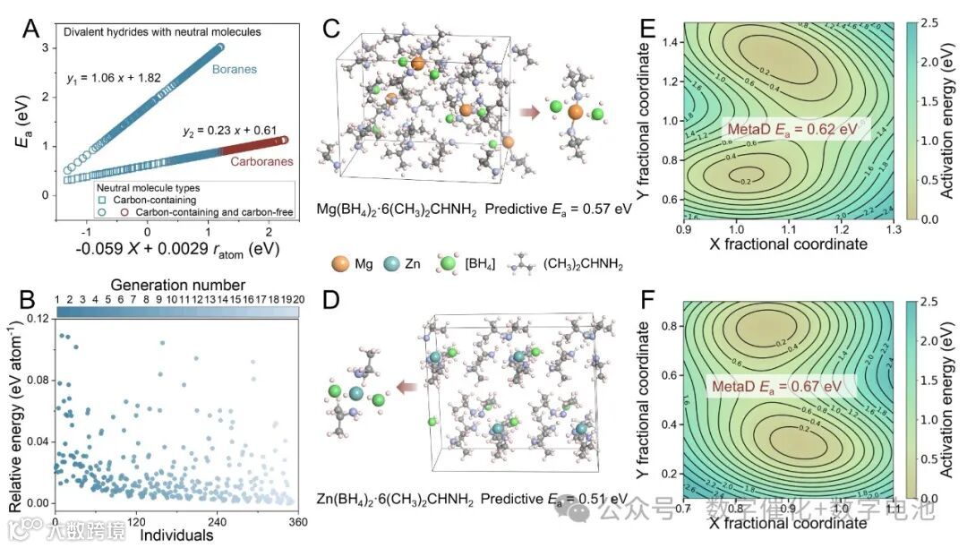 图4. 基于智能工作流的氢化物SSE预测。(A)二价氢化物SSE的多重线性相关预测。(B)生成过程中获得的相对能量。(C)Mg(BH4)2·6(CH3)2CHNH2和(D)Zn(BH4)2·6(CH3)2CHNH2的晶体结构和局部配位环境环境。(E)Mg(BH4)2·6(CH3)2CHNH2中镁离子迁移和(F)Zn(BH4)2·6(CH3)2CHNH2中锌离子迁移的势能面。