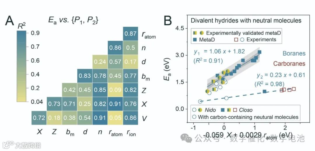系统性构建了包含原子电荷、电负性、配位数等在内的八大特征描述符,成功实现对二价离子活化能(Ea)的高精度预测(R2 > 0.90)。在单一参数拟合中发现,在BH4体系中,Ea与ratom、X和Z的相关性分别达到了R2 = 0.99、0.98 和 0.97;而在closo型SSE中,对应的R²值则为0.83、0.86 和 0.78。这三类描述因子均属于材料的固有物理属性,无需额外的第一性原理计算,因而极具推广价值,是指导下一代SSE材料设计的强有力工具。为进一步统一两种类型的氢化物SSE,并将结论推广至更宽泛的材料体系,我们采用多元线性回归模型:Ea = a₁·P₁+a₂·P₂+b(其中Pᵢ为选定的特征参数,aᵢ和b为拟合系数)。结果表明,当选择特征对为(ratom, X)和(n, V)时,拟合效果最佳,R2均达0.91(图3A)。