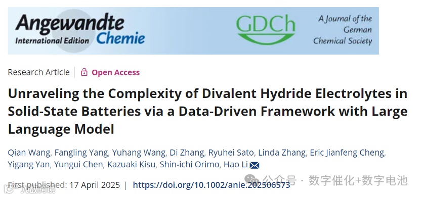 Qian Wang, Fangling Yang, Yuhang Wang, Di Zhang, Ryuhei Sato, Linda Zhang, Eric J. Cheng, Yigang Yan, Yungui Chen, Kazuaki Kisu, Shin-ichi Orimo, Hao Li*, “Unraveling the Complexity of Divalent Hydride Electrolytes in Solid‐State Batteries via a Data‐Driven Framework with Large Language Model.” Angewandte Chemie International Edition, 2025, e202506573.