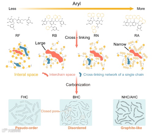 硬碳材料因具有高比容量和丰富的缺陷/孔结构,被视为钠离子电池的理想负极材料。其中,平台容量(低电位区)是决定硬碳电极能量密度的关键因素,但其形成机制与闭孔结构的关系尚不明确。酚醛树脂(PF)因其高碳产率、结构可设计性强等优势,成为规模化制备硬碳负极的重要前驱体。然而,现有改性策略(如离子催化、杂原子掺杂)虽能提升循环稳定性,却常导致库仑效率和平台容量下降。近期研究通过预氧化、复合设计或引入造孔剂等方法优化闭孔形成,但仍缺乏对闭孔形成机制的分子水平解析。本文基于醛分子侧基空间构型调控的策略,提出平衡酚醛树脂的交联度与刚性,在碳化过程中抑制碳层重排并促进闭孔形成。本文在分子水平设计上为其他聚合物衍生的硬碳负极构造闭孔提供了新思路。