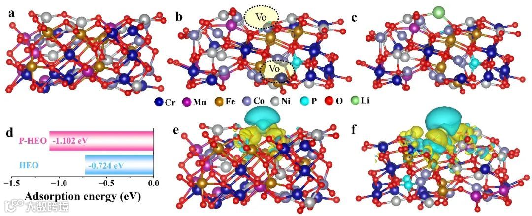进一步研究类金属P掺杂与HEO阳极储锂性能的关系,进行DFT第一性原理计算。在HEO中不掺杂和掺杂类金属P的高折射率晶面(311)的理想模型如图7a,b所示。与HEO相比,由于P的引入,P-HEO的原子结构模型中存在大量的氧空位。插入Li+后的优化吸附模型如图4c所示,吸附能计算结果如图4d所示。P-HEO的绝对吸附能为- 1.102 eV,大于HEO的绝对吸附能(- 0.724 eV),说明类金属P掺杂形成氧空位的材料更容易吸附Li+。HEO和P-HEO在Li+插入过程中的电荷密度差异如图7e、f所示。在这张可视化图中,青色表示电子云的大小,而黄色表示电荷积累,共同说明影响Li+吸附的电荷再分配行为。研究结果表明,Li+和P-HEO之间存在强大的电子耦合,这归因于磷取代金属原子导致晶格扭曲和氧空位的产生。P-HEO中Li+周围的电荷空间大于HEO中Li+周围的电荷空间,与计算的吸附能吻合良好。