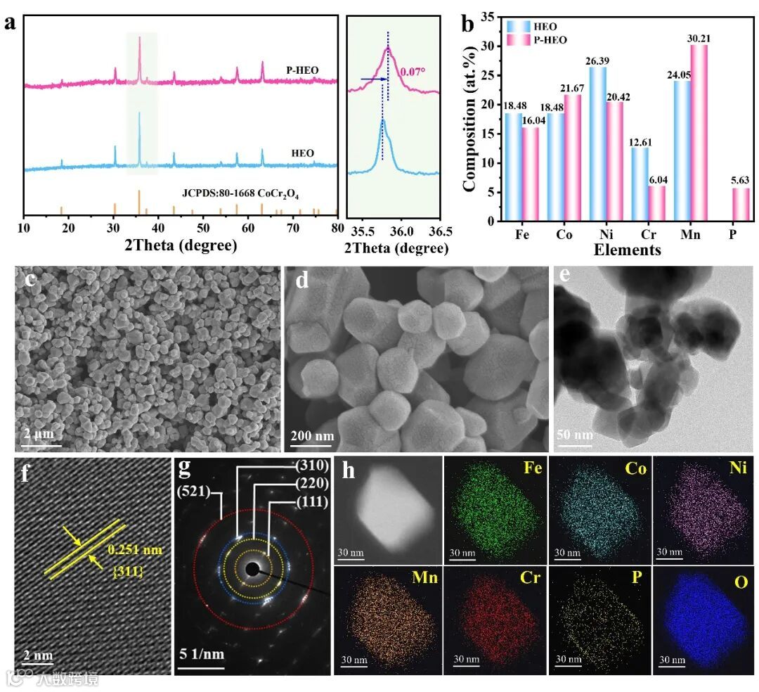 (PxA1-x)B2O4对应的HEO和P-HEO样品的XRD谱图如图2a所示,其中所有衍射峰均与JCPDS No. 80-1668一致,证实了单相尖晶石HEO的形成。对35°附近的的XRD衍射峰进行局部放大,发现P-HEO的XRD衍射峰与HEO相比,向高角度偏移0.07°,表明P掺杂使晶格间距减,证明掺杂工程的成功。在化学晶格掺杂中,P原子作为PO43−掺杂剂被引入,这是因为煅烧过程发生在空气中,没有任何还原条件将P还原成其他价态。此外,PO43−表现出四面体配位。在尖晶石结构中,有些金属是四面体配位的,有些是八面体配位的。因此,我们认为PO43−的掺杂类似于P取代四面体配位的金属,并与四个氧原子配位,这将导致原始晶格畸变。此外,由于NH4H2PO4在高温热分解过程中产生的NH3具有还原性,导致HEO中氧空位的生成。由于柠檬酸对不同的离子具有有效的络合作用,制备的P-HEO和HEO粉末具有良好的分散性,如图2c、d所示。TEM(图2e)显示P-HEO呈块状结构,颗粒均匀(≈50 nm)。图2f的HRTEM显示晶格间距为0.251 nm,对应尖晶石结构的(311)晶面,进一步证实了(PxA1-x)B2O4的形成。图2g SAED中的多晶衍射环指向(111)、(220)、(310)和(521)晶面,显示出尖晶石的典型微观结构特征,与HRTEM结果一致。值得注意的是,HAADF-STEM和EDS Mapping(图2h)显示,所有预期元素的纳米颗粒呈现均匀分布,包括Fe, Co, Ni, Cr, Mn, O和P。这表明磷的掺杂过程并未导致HEO中金属元素的分离。