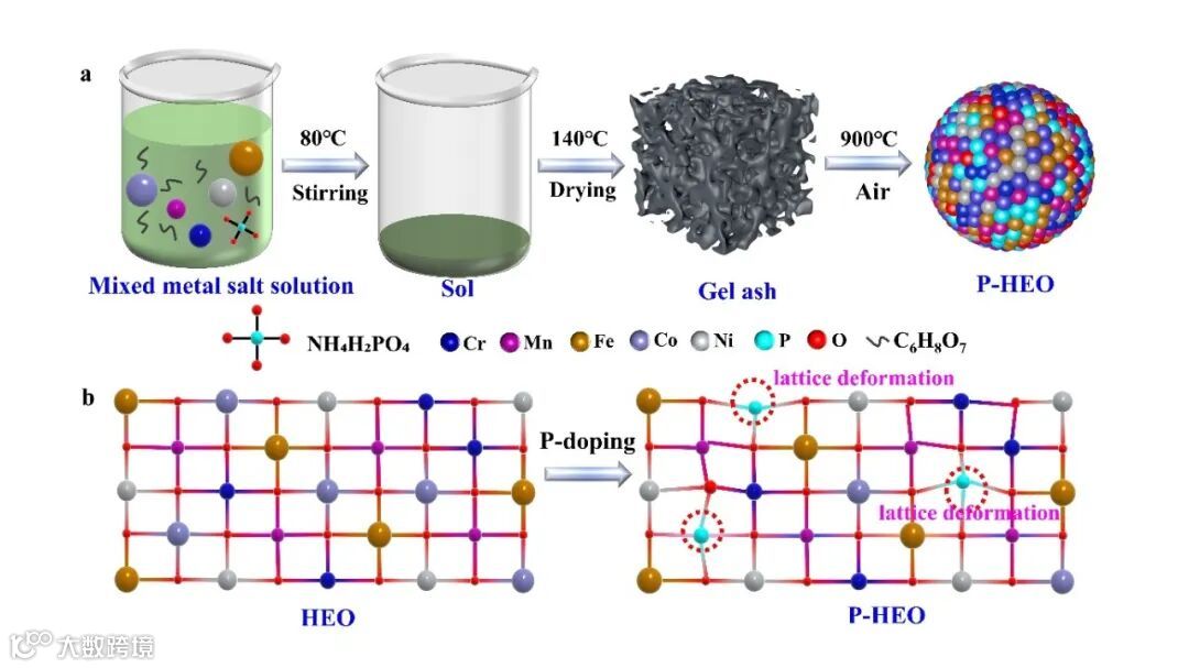 图1. 类金属P掺杂高熵金属氧化物制备工艺示意图与P掺杂引起的晶格畸变图。