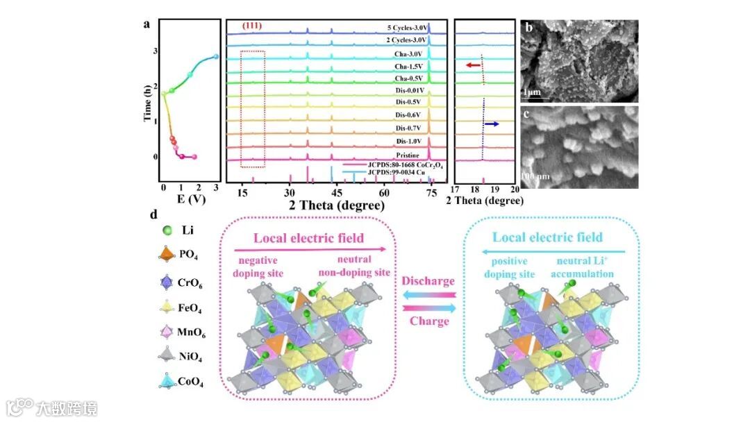 利用非原位XRD研究了P-HEO阳极在不同电荷状态下的相变,分析了循环过程中锂的储存机理。如图8a红色框所示,从1.0 V放电到0.01 V时,包含(111)晶面的衍射峰逐渐减弱并向更高角度偏移。在充电时,衍射峰向较低角度偏移,这可能是由于嵌入的Li+与阴离子结合,从而引起晶格畸变。值得注意的是,在1.0 V放电至0.01 V的过程中,衍射峰强度逐渐减小直至消失,表明形成了非晶结构。这有利于对抗电极材料的体积变化,也有利于保持电极的稳定性,从而提高电极材料的可逆性能。相反,(111)的衍射峰在0.5 ~ 3.0 V范围内重新出现并变得更加强烈,表明P-HEO材料在整个充放电循环过程中具有良好的晶格可逆性和结构稳定性。此外,我们探索了循环后P-HEO电极的形貌变化,经过100次循环后的电极表面SEM如图3b、c所示。电极材料仍然保持其形态结构,没有明显的团聚或断裂。