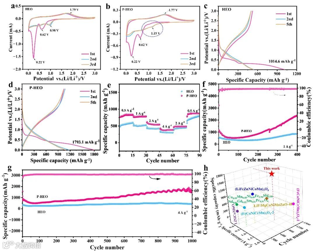 通过元素组分调控和结构设计,最终得到具有类金属磷掺杂高熵金属氧化物负极材料其展现出出色的电化学储锂性能。相较于未改性样品,P-HEO电极材料表现出较高的初始放电比容量(图5c-d)、优异的倍率性能(图5e)以及循环稳定性(图5f-g),在1A g-1的电流密度下经历400次循环的放电比容量达到2535.7 mAh·g-1,明显超过HEO的490.9 mAh·g-1。此外,P-HEO表现出优异的库仑效率(循环400次后>97%)。即使在4A g-1的高电流密度下,P-HEO阳极在1000次循环后仍保持1647.1 mAh·g-1的高比容量。这些发现表明,P-HEO阳极在一定电流密度范围内表现出优异的锂存储活性和循环稳定性,超过了最近文献中记录的大多数HEO阳极的性能(图5h)。