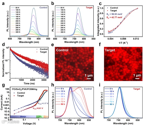 Fig. 2. Temperature-dependent PL spectra of (a) the control and (b) target perovskite films from 80 to 300 K. (c) Corresponding integrated PL intensity and fitting curves of Arrhenius equation. (d) TRPL spectra of the control and target perovskite films deposited on glass substrates. PL mapping images of (e) the control and (f) target perovskite films. (g) SCLC measurements of the electron-only devices. Normalized steady-state PL spectra of (h) the control and (i) target perovskite films under one-sun illumination at N2 atmosphere for 0-96 h, respectively.