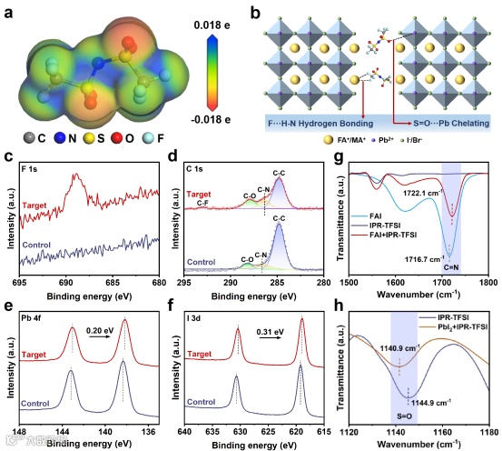 Fig. 3. (a) Calculated ESP profile of TFSI- anion. (b) Schematic diagram of TFSI- anions interact with perovskites. XPS spectra of (c) F 1s, (d) C 1s, (e) Pb 4f and (f) I 3d orbits of the control and target perovskite films. FTIR spectra of (g) FAI, IPR-TFSI and FAI mixed with IPR-TFSI and (h) IPR-TFSI and PbI2 mixed with IPR-TFSI.
