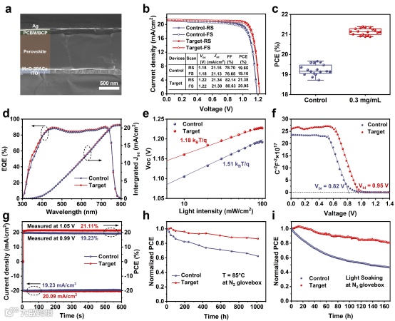 Fig. 4. (a) Cross-sectional SEM image of the device. (b) The champion J-V curves and (c) PCE statistical distribution of the control and target PSCs. (d) EQE spectra and integral current densities of the champion control and target PSCs. (e) VOC versus light intensity curves of devices. (f) Mott-Schottky plots of devices at 10 kHz. (g) Steady-state photocurrent and PCE of the control and target PSCs measured near the maximum power point with a bias of 0.99 V and 1.05 V. (h) Thermal stability of the control and target PSCs in N2 atmosphere at 85°C. (i) Light-soaking stability of the control and target PSCs under AM 1.5G one-sun illumination in N2 atmosphere.