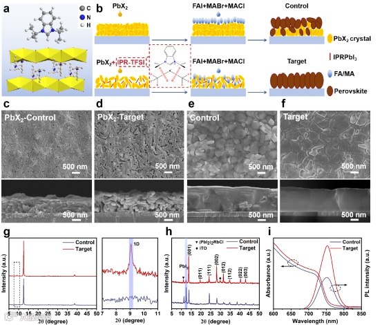 Fig. 1. (a) The molecular structure of IPR+ and side-view crystal structure of the 1D IPRPbI3 perovskite structure (the yellow octahedron indicates the [PbI6]4- unit). (b) Schematic illustration of the perovskite phase converted from the control of compact PbX2 films and target porous PbX2 films, respectively. Top-view and cross-sectional SEM images of (c) the control and (d) target PbX2 films. Top-view and cross-sectional SEM images of (e) the control and (f) target perovskite films. XRD patterns of (g) the control and target PbX2 films and (h) the control and target perovskite films. (i) UV-Vis-NIR absorption and steady-state PL spectra of the control and target perovskite films.