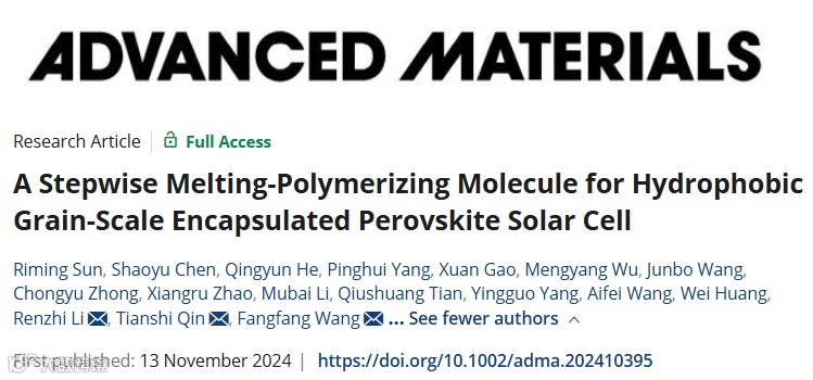 近日,来自南京工业大学的王芳芳副教授、李仁志教授与中山大学的秦天石教授,在国际知名期刊Advanced Materials上发表题为“A Stepwise Melting-Polymerizing Molecule for Hydrophobic Grain-Scale Encapsulated Perovskite Solar Cell”的观点文章。该观点文章分析了钙钛矿太阳能电池商业化仍然存在挑战,特别是它们的长期稳定性和有毒铅的环境影响,设计了一种逐步熔融聚合分子(SMPM)——3氟-4-甲氧基-N,N-双(4-乙烯基苯基)苯胺,用来作为FAPbI3钙钛矿的添加剂,实现在钙钛矿退火过程中独特的多阶段转变并能够形成疏水性晶粒级封装层。