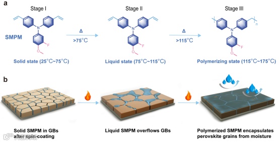 文章揭示了SMPM在钙钛矿退火过程中的三阶段相变。a)阶段Ⅰ:从室温到75 °C保持原始的固态的SMPM; 阶段Ⅱ:SMPM在75 °C至115 ° C之间熔融成液态; 阶段Ⅲ:SMPM在115 °C以上通过自引发热聚合(SITP)聚合。b)通过使用SMPM作为添加剂的热退火钙钛矿膜的示意图。阶段Ⅰ:在旋涂工艺之后,原始SMPM以固态存在于钙钛矿膜的晶界(GBs)内;阶段Ⅱ:在初始退火期间,SMPM熔化成液态,并伴随着其沿着GBs渗透;阶段Ⅲ:在最终退火期间,SMPM最终通过自引发热聚合(SITP)转变为非晶态,从而实现在钙钛矿晶粒上方和周围形成疏水的晶粒级封装。