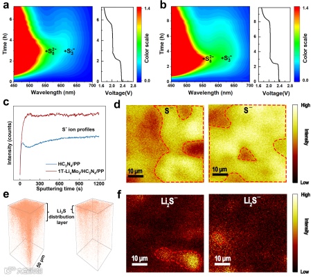 然后进一步研究了1T-LixMoS2/HC3N4的改性机制和电催化能力。原位紫外测试结果表明,1T-LixMoS2/HC3N4能够促进S3.-的形成,从而加速S8分子的开环反应,提高硫的利用率。结合飞行时间二次离子质谱分析,使用1T-LixMoS2/HC3N4的电池正极表现出更强的二次S-离子强度。此外,锂负极的三维结构图像显示,1T-LixMoS2/HC3N4/PP体系中的Li2S分布更少、更浅,这是因为硫还原反应的动力学增强,从而抑制了穿梭效应。