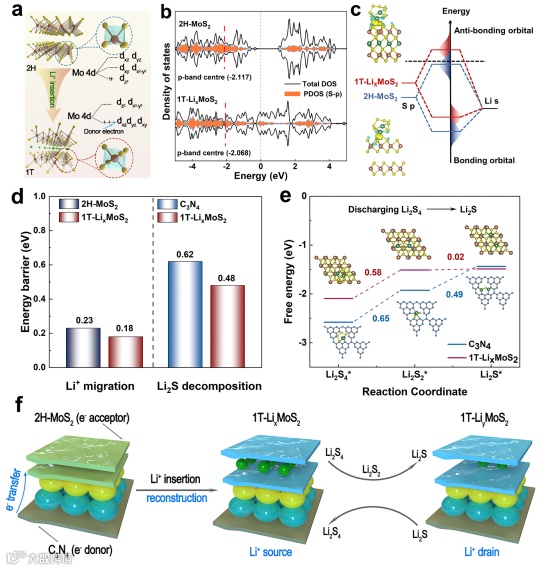 首先,采用密度泛函理论(DFT)计算来评估“电子-Li+”储层的设计。态密度(DOS)结果显示在费米能级附近1T-LixMoS2表现出更高的DOS,这代表了典型的金属特性。此外,1T-LixMoS2也体现出更高的S-p带中心,表明其与多硫化物中的Li-s能带将产生更强的杂化从而加强相互作用。此外1T-LixMoS2与2H-MoS2相比,表现出更低的Li+扩散势垒(0.18 vs. 0.23 eV),这证实了其加速Li+动力学的能力和电化学重构的优势。进一步结合吉布斯自由能和Li2S分解能垒,验证了1T-LixMoS2优越的催化硫双向转化的能力。此外,1T-LixMoS2/C3N4中的电子会从C3N4侧定向移动到1T-LixMoS2侧,这意味着1T-LixMoS2作为电子受体可以进一步促进Li+的嵌入。因此,1T-LixMoS2既是“Li+源”,向硫还原过程提供Li+,又是“Li+库”,通过C3N4的电子调节作用从硫氧化过程接收Li+。