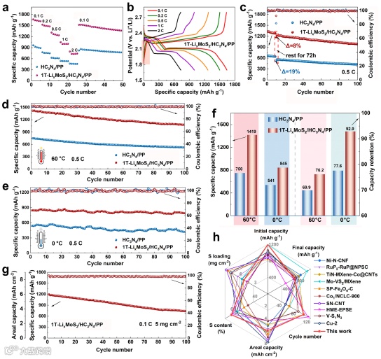 此外,还对电池在各种条件下的充放电和循环性能进行了评估。在倍率测试中,使用1T-LixMoS2/HC3N4/PP的电池始终表现出更高的初始容量和稳定性,尤其是在0.1 C时,初始放电比容量达到了1668 mAh g-1。然后,对不含硫正极的1T-LixMoS2/HC3N4/PP电池的额外容量进行了测试,结果显示,即使在0.1 C条件下循环500次后,其容量仍能保持在80 mAh g-1以上,这支持了“Li+源”和“Li+库”的催化策略。此外,自放电实验也反映出1T-LixMoS2/HC3N4出色的抗自放电性能。进一步探索高温和低温下的循环性能,在60 ℃和0 ℃条件下,使用1T-LixMoS2/HC3N4/PP的电池均表现出优异的循环稳定性和容量保持率,有力地证明了该电池具有出色的宽温域适应性。此外,采用1T-LixMoS2/HC3N4/PP的电池在5 mg cm-2的高硫负载下,初始面容量接近6 mAh cm-2。此外,硫负载进一步增加到7.5 mg cm-2,E/S比仅为6.8 µL mg-1时,改性电池在的初始容量达到了7.1 mAh cm-2,达到了商用电池的容量要求。然后与最新研究成果进行比较,证明了1T-LixMoS2/HC3N4/PP在高硫负载下的潜在性能。