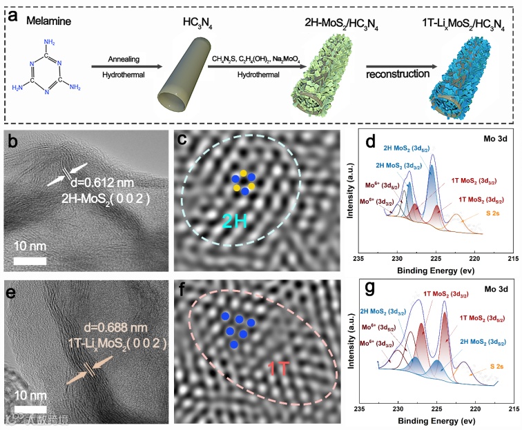 基于上述DFT计算结果,采用水热法和电化学重构制备出1T-LixMoS2/HC3N4。通过透射电子显微镜(TEM)和X射线光电子能谱(XPS)验证了材料形貌和相变。如高分辨率 TEM(HRTEM)所示,MoS2的晶体结构以2H相为主,其中2H相所占比例为68.78%。在电化学方法中,Li+嵌入2H-MoS2/HC3N4的范德华层间从而导致相重构,形成了1T-LixMoS2/HC3N4。其中,1T 相的比例变为69.49%。此外,X射线衍射(XRD)图谱显示,1T-LixMoS2的(002)晶面对应的衍射峰向低角度移动,且在~9°的位置处出现了新的衍射峰,这表明层间距扩大,晶体结构发生了重构。进一步结合拉曼光谱,与2H-MoS2/HC3N4相比,1T-LixMoS2/HC3N4在148.7、223.7和332.7 cm-1处的特征峰明显增强,这表明MoS2发生了从2H到1T的相变。