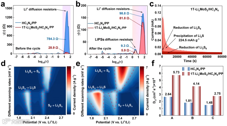 1T-LixMoS2/HC3N4的催化效果通过与Li+传输和硫物种氧化还原相关的各种电化学测量进行了评估。首先,循环前后的弛豫时间分布(DRT)显示,与使用HC3N4/PP的电池相比,使用1T-LixMoS2/HC3N4/PP的电池均显示出更低的Li+扩散电阻。然后,利用恒电流间歇滴定技术(GITT)观察电池的动力学过程。液固硫物种之间的转化效率决定了电池的整体动力学过程,而与使用HC3N4/PP的电池(64和151 mV)相比,使用1T-LixMoS2/HC3N4/PP的电池显示出较低的电压降(51和137 mV)。此外,根据GITT计算出的Li+扩散系数和内阻,验证了1T-LixMoS2/HC3N4充当Li+储层、加速Li+传输的作用。进一步结合Li2S的沉积溶解实验验证了1T-LixMoS2/HC3N4对决速步的促进作用。此外,通过循环伏安法(CV)测试验证了电化学动力学与催化能力之间的关系,与使用HC3N4/PP的电池相比,使用1T-LixMoS2/HC3N4/PP的电池在硫物种的还原(S8Li2Sn、Li2SnLi2S)和氧化(Li2SnS8)过程中都具有更高的响应电流,表现出优异的催化性能,拟合出的Tafel斜率和Li+迁移系数还验证了更快的电化学动力学和电子-Li+传输动力学。
