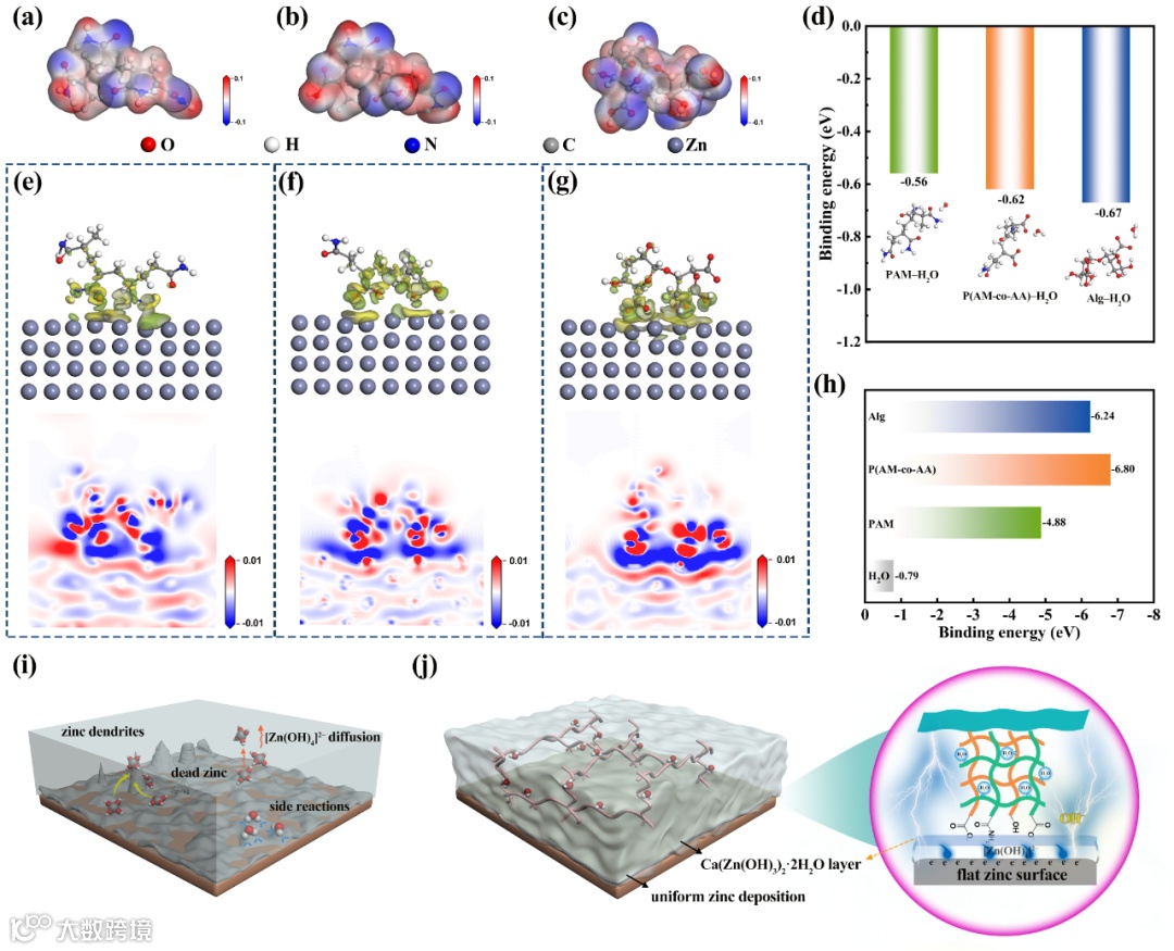 本文在结构设计的基础上,将可被离子交联纠缠的生物聚合物海藻酸钠(NaAlg)引入到化学交联的P(AM-co-AA) 共聚物中,合成了互穿聚合物水凝胶电解质IPN–Alg。实验和理论计算结果表明,IPN–Alg水凝胶电解质的引入在锌电极表面原位构建了有机–无机界面层,有助于获得稳定的锌电极。首先,IPN–Alg水凝胶电解质具有优异的亲水性和亲锌性,降低了游离水的含量和活性,并优先吸附在锌电极表面,构建贫水界面、抑制界面副反应的发生、促进锌的均匀沉积。其次,互穿双网结构的构建使IPN–Alg具有优异的机械强度,有利于抑制枝晶生长。同时,循环过程中在锌电极表面原位生成的Ca(Zn(OH)3)2·2H2O无机保护层,作为[Zn(OH)4]2−的扩散屏障,减少了放电产物的损失和电极的形状变化。得益于以上优势,基于IPN–Alg水凝胶电解质组装的Zn||Zn对称电池和锌镍软包电池的循环寿命均显著延长,分别在2 mA cm−2和4 C、40% DOD条件下稳定循环超过800 h和1100 h(563次)。本工作对于优化锌电极在强碱性环境下的稳定性、推进锌基电池进一步应用具有重要意义。