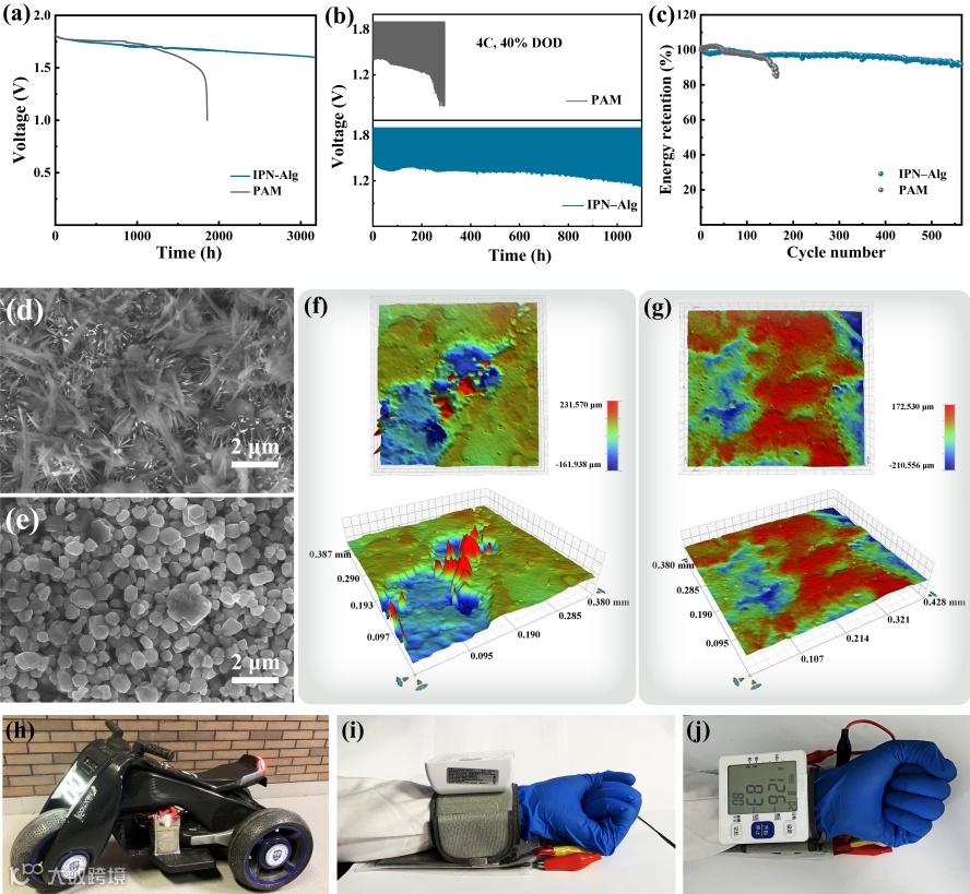 为了证明所制备凝胶聚合物电解质的实际应用潜力,组装了锌镍软包电池,并进行了电化学性能测试。使用PAM凝胶电解质组装的锌镍电池在4C、40% DOD条件下循环290 h(164次)后放电电压衰减明显,放电能量仅为初始放电能量的84.8%。使用IPN–Alg凝胶电解质的锌镍电池具有显著延长的循环寿命,可以稳定循环超过1100 h(563次),放电能量保持率高达91.8%。将所组装的锌镍软包电池串联作为电源,可以成功驱动玩具摩托车和电子血压计运行,验证了基于IPN–Alg凝胶电解质的锌镍电池具有良好的实用应用潜力。