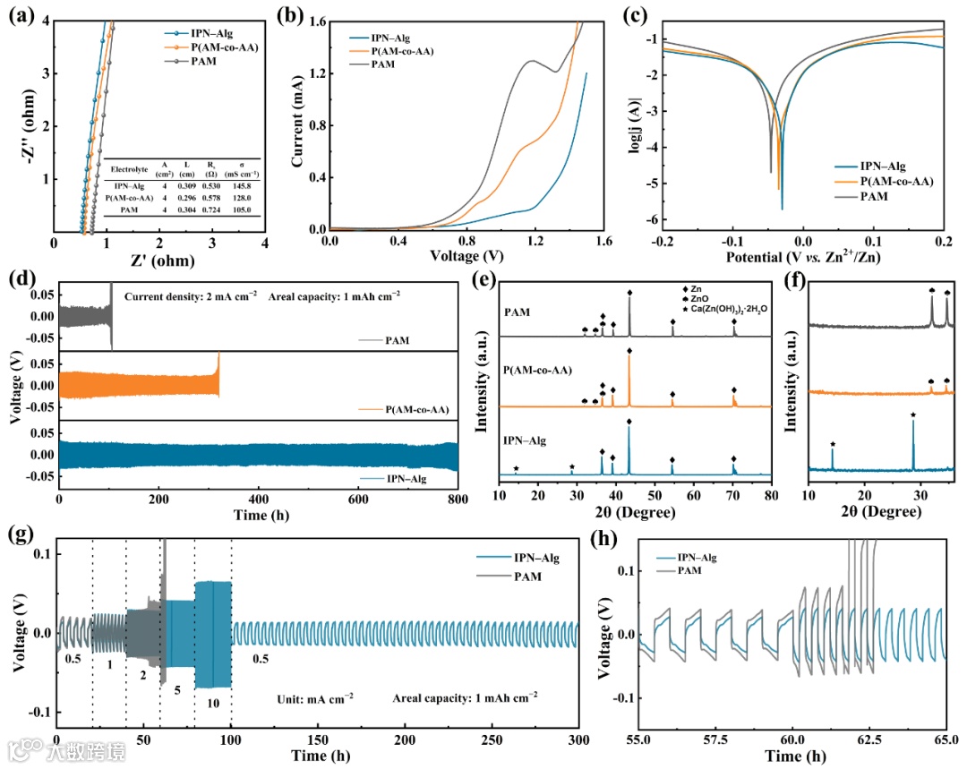 通过对Zn||Zn对称电池进行恒流充放电测试,对所合成凝胶与锌电极的电化学相容性进行了研究。在2 mA cm−2、1 mAh cm−2条件下,采用PAM凝胶电解质的Zn||Zn对称电池极化严重,仅105 h后就发生了失效。在P(AM-co-AA)凝胶电解质中,对称电池的电压波动不明显,电池循环时间比PAM增加了一倍(~320 h)。基于互穿聚合物电解质IPN–Alg组装的对称电池的循环寿命得到了显著延长,约为800 h,电压更加稳定,表明其具有更好的锌沉积/溶解可逆性。在IPN–Alg凝胶电解质中循环后的锌电极表面几乎没有检测到ZnO的特征峰,而是出现了新的物相Ca(Zn(OH)3)2·2H2O(JCPDS No. 24-0222),这是由电解质电离产生的Ca2+离子与锌电极的放电产物在碱性溶液中发生反应生成的。所形成的Ca(Zn(OH)3)2·2H2O无机界面层溶解度较小,可以抑制[Zn(OH)4]2−从锌电极表面向本体电解质的扩散,从而起到促进锌电极均匀沉积和抑制电极形变的作用。