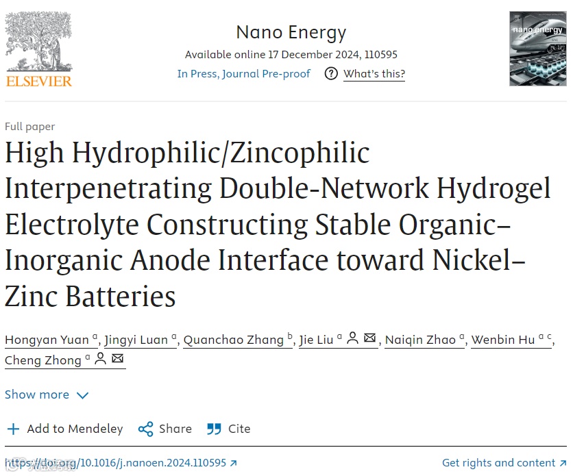 H. Yuan, J. Luan, Q. Zhang, J. Liu, N. Zhao, W. Hu, C. Zhong, High hydrophilic/zincophilic interpenetrating double-network hydrogel electrolyte constructing stable organic–inorganic anode interface toward nickel–zinc batteries, Nano Energy, (2024) 110595. https://doi.org/10.1016/j.nanoen.2024.110595