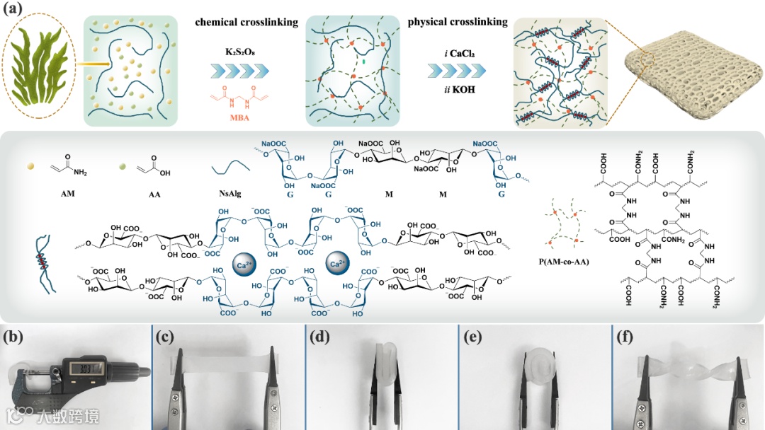 图1. IPN–Alg水凝胶电解质合成示意图及实物图
