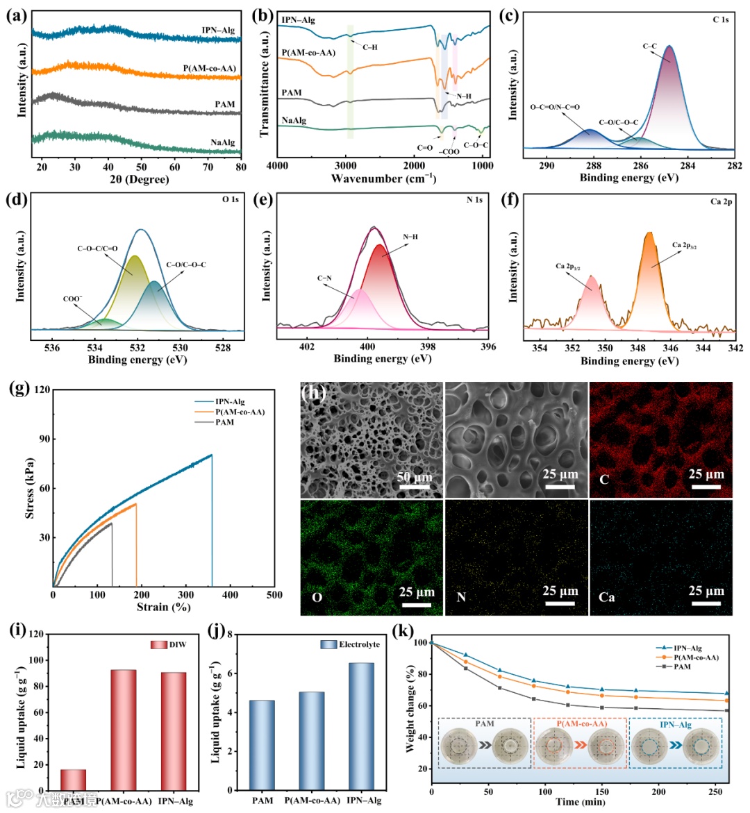 IPN–Alg呈典型的无定型结构,有利于降低离子的传输阻力,提高电解质的离子电导率。IPN–Alg具有均匀、致密的层状多孔结构,这种三维的交联拓扑结构有利于基质的能量耗散,为其优异的机械性能提供了佐证。此外,聚合物基质中紧密互联的孔隙有助于捕获和保留大量的电解液,从而促进电解质中离子的传输。所合成的IPN–Alg互穿凝胶聚合物的强度和韧性得到了明显提高,分别为80.6 kPa和358.5%,比PAM提高了两倍以上。通过对应力–应变曲线进行积分得到PAM、P(AM-co-AA)和IPN–Alg的断裂韧性分别为29.4、61.0和185.7 kJ m−3,进一步证明了引入Alg对提升凝胶聚合物机械性能的重要作用。