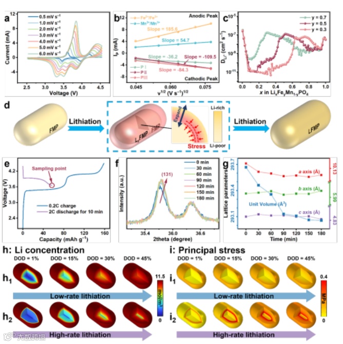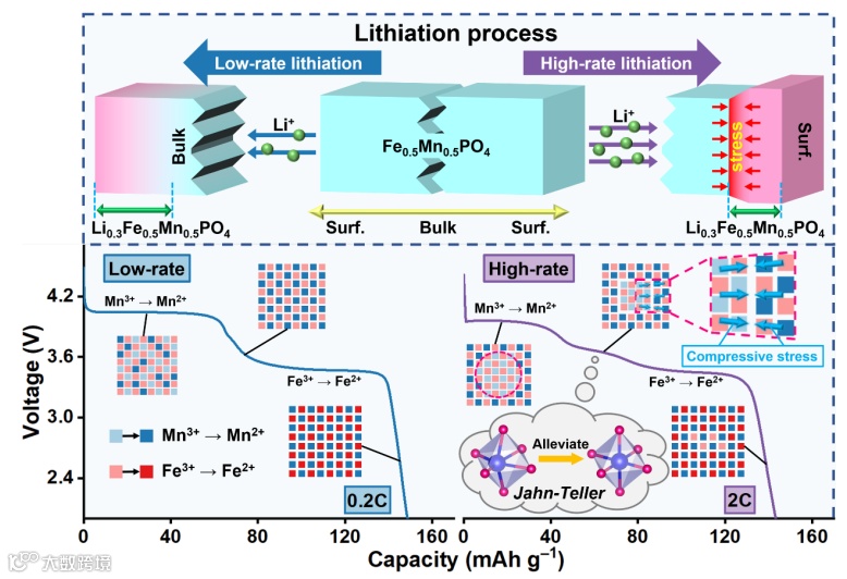 动力学分析表明,PⅡ放电阶段Li+扩散能力最强。受PⅠ动力学的限制,Li+首先富集在颗粒表层而导致体系中锂的不均匀分布。随着锂化的进行,晶格边界受到应力的作用而导致Mn3+的放电电压降低,形成PⅡ。结构弛豫分析和有限元模拟验证了应力的存在及演变。在停止放电后,LFMP的晶格在一定时间内会逐渐恢复稳定,释放晶格应力。此外,b轴的扩散空间会因为应力的作用而扩大,有利于Li+的扩散。DFT计算表明,在压应力的作用下,Mn3+的工作电压会降低,但同时也使得Li+的扩散势垒降低和Jahn-Teller扭曲减弱,Mn3+的容量得以充分释放。进一步原位XRD也证实了电化学行为与结构演变的内在关系。高放电倍率下显著的体积变化使得富锂相和贫锂相的相界处产生了显著的应力集中,从而导致上述一系列电化学结果。