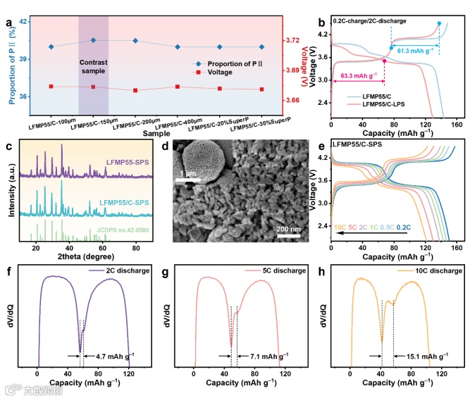 在相同测试条件下,不同厚度和不同导电剂含量的LFMP正极材料中P Ⅱ的占比和电压基本一致,表明电极反应速率主要受离子扩散控制。此外,通过进一步细化颗粒能够显著抑制P Ⅱ的形成。得益于较短的Li+扩散距离,仅在超高倍率下才能观察到P Ⅱ平台。