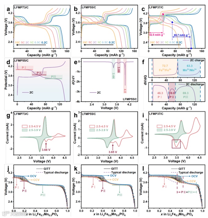 基础电化学测试结果表明,PⅡ的容量归属于Mn3+→Mn2+,其放电行为仍位于Mn2+/Mn3+氧化还原电对的工作范围内。此外,PⅡ的工作电压随着Mn含量的增加而降低;当LFMP中Mn的占比达到70%时,PⅡ的放电电压与Fe3+→Fe2+接近。2C循环结果显示,PⅡ在循环过程中几乎不发生改变,其作为一种固有属性稳定存在于LFMP的放电曲线中。不同充放电模式下的测试结果表明,Fe3+的容量衰减不受充电深度的影响,是典型极化过程的一部分,而P Ⅱ的存在可以促进Mn3+容量的释放。