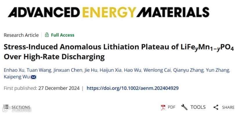 橄榄石型磷酸锰铁锂(LFMP)因具有比磷酸铁锂(LFP)更高的能量密度,被认为是下一代锂离子电池正极材料的有力竞争者。通常,LFMP的放电曲线有两个平台:分别位于4.1 V(Mn3+/Mn2+)和3.45 V(Fe3+/Fe2+)。然而,在大量研究报道中,LFMP的放电曲线出现了介于4.1 V和3.45 V之间的一个异常锂化平台(特别是在高倍率放电下),其形成原因和嵌锂机制尚不明确。异常平台的出现,不但会降低LFMP电池的能量密度,还会影响不同批次电池之间的一致性。因此,亟需全面了解异常锂化平台的形成机制。